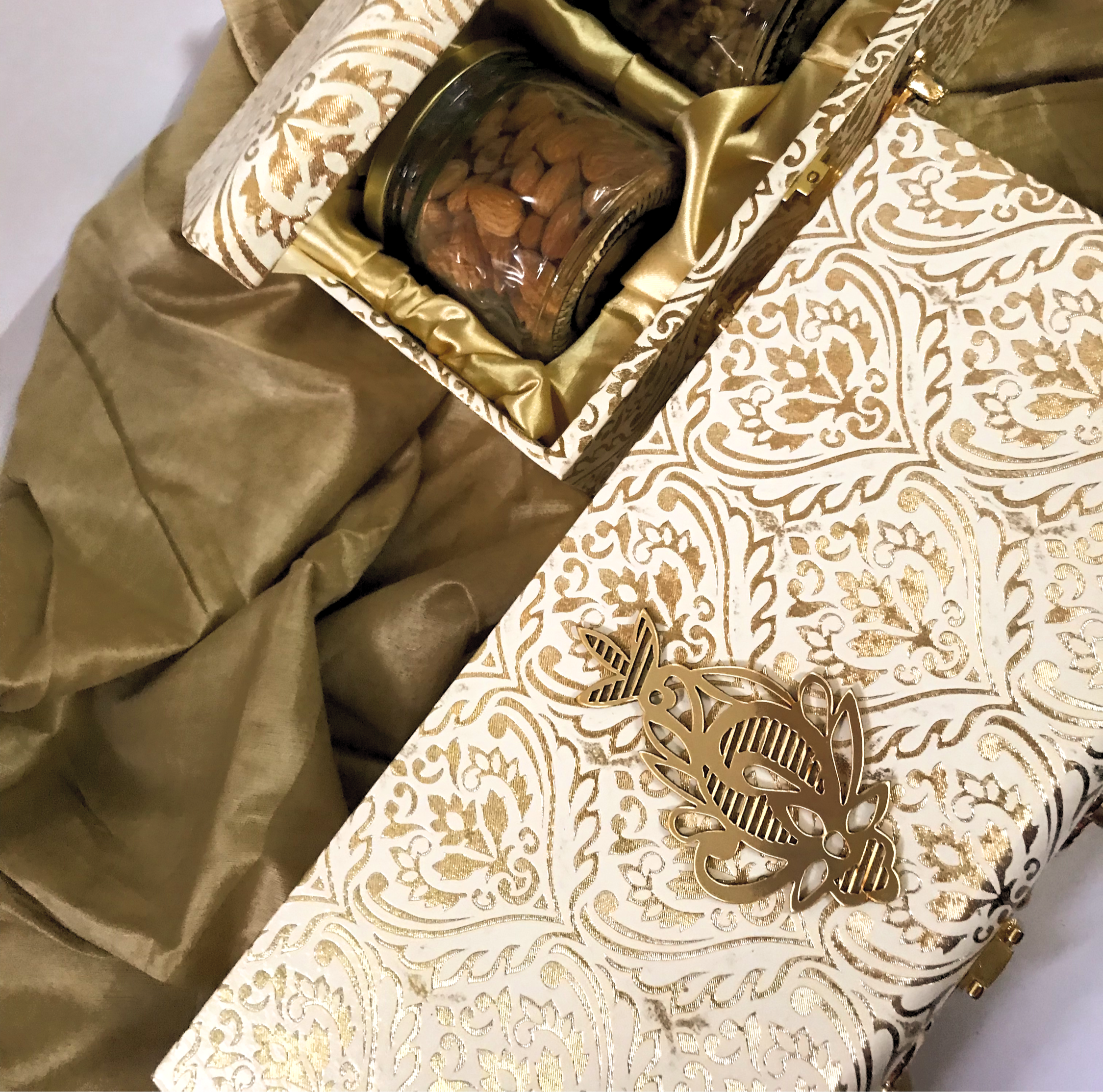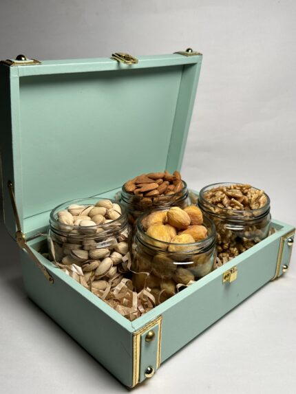 The Gold Square Basket contains 3 assorted Dry Fruit Jars: Plain California Almonds, Roasted & Salted or Plain Cashewnuts/Pistachios, and Raisins (Kishmish). Each jar is filled with premium, handpicked dry fruits, ensuring freshness and quality in every bite. Our elegant packaging is not only a feast for the eyes but also practical, as the Box is duly Shrink-wrapped to preserve the natural flavors. Perfect for gifting or personal enjoyment, elevate your snacking experience with this luxurious assortment delivered right to your doorstep.