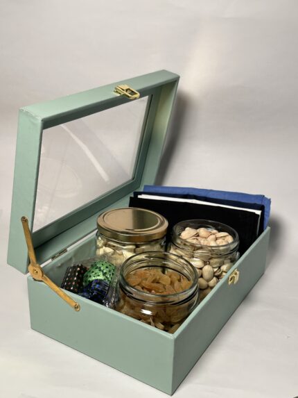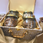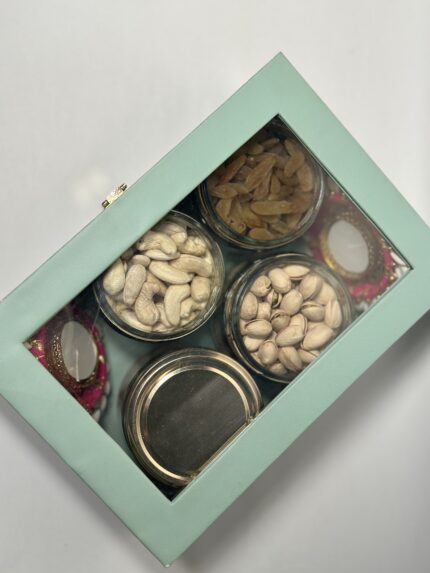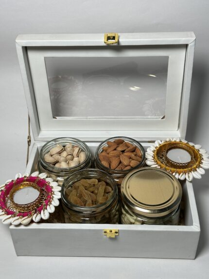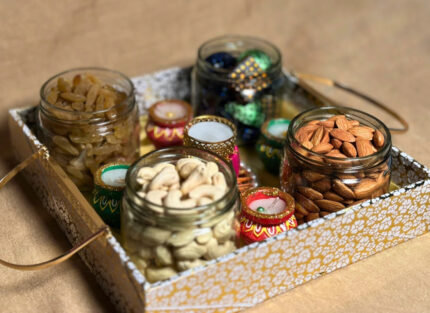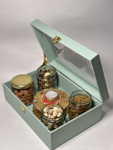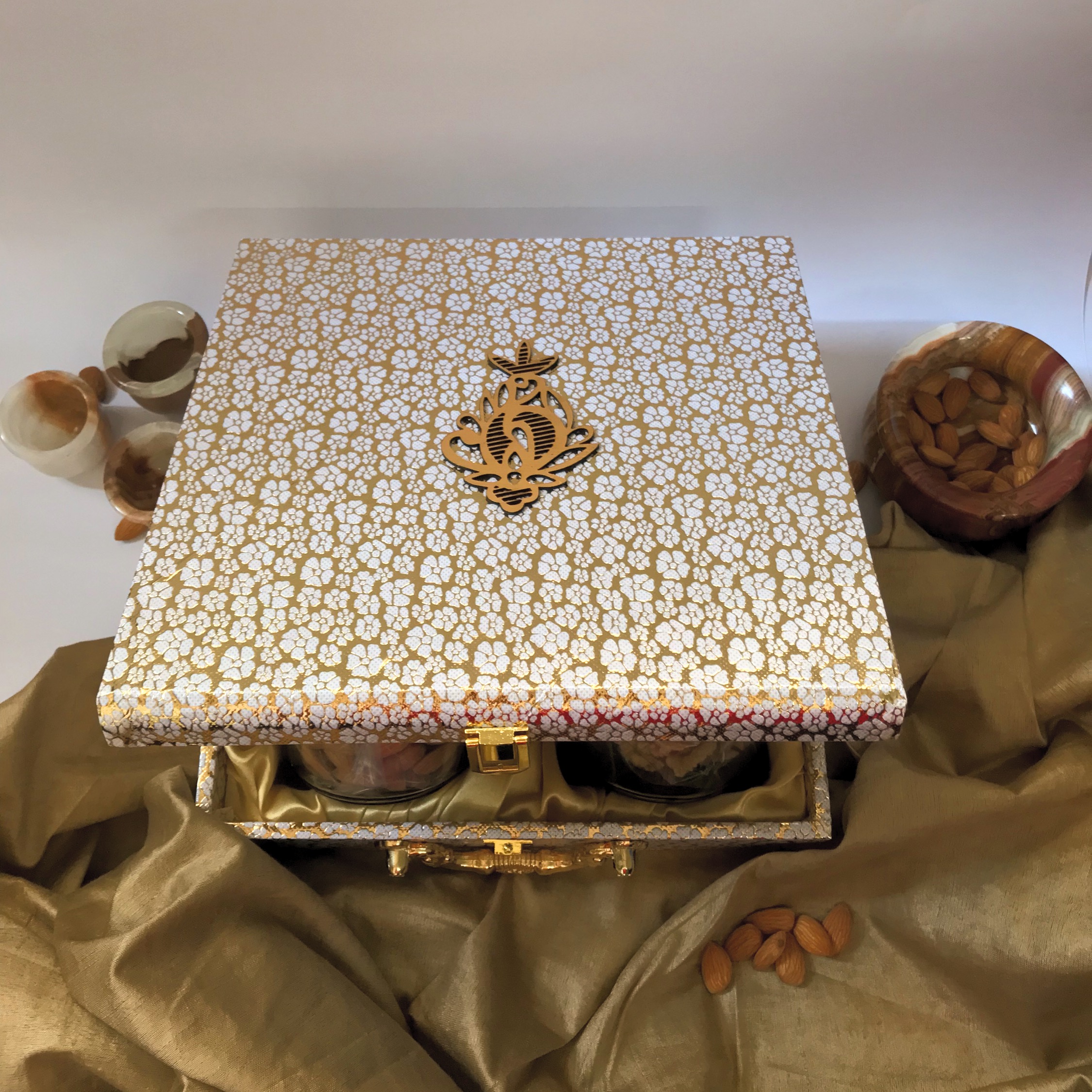 The 4-Jar Gold Box contains 4 assorted Dry Fruit Jars, featuring Plain California Almonds, Roasted/Salted or Plain Cashewnuts, Chile Walnut Kernels, and Raisins (Kishmish). Each jar is carefully packed and the tray is duly shrink-wrapped for freshness. Experience premium quality and convenience straight to your doorstep with our thoughtfully curated selection. Elevate your snacking or culinary creations with these nutritious and delicious dry fruits.