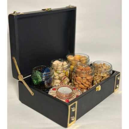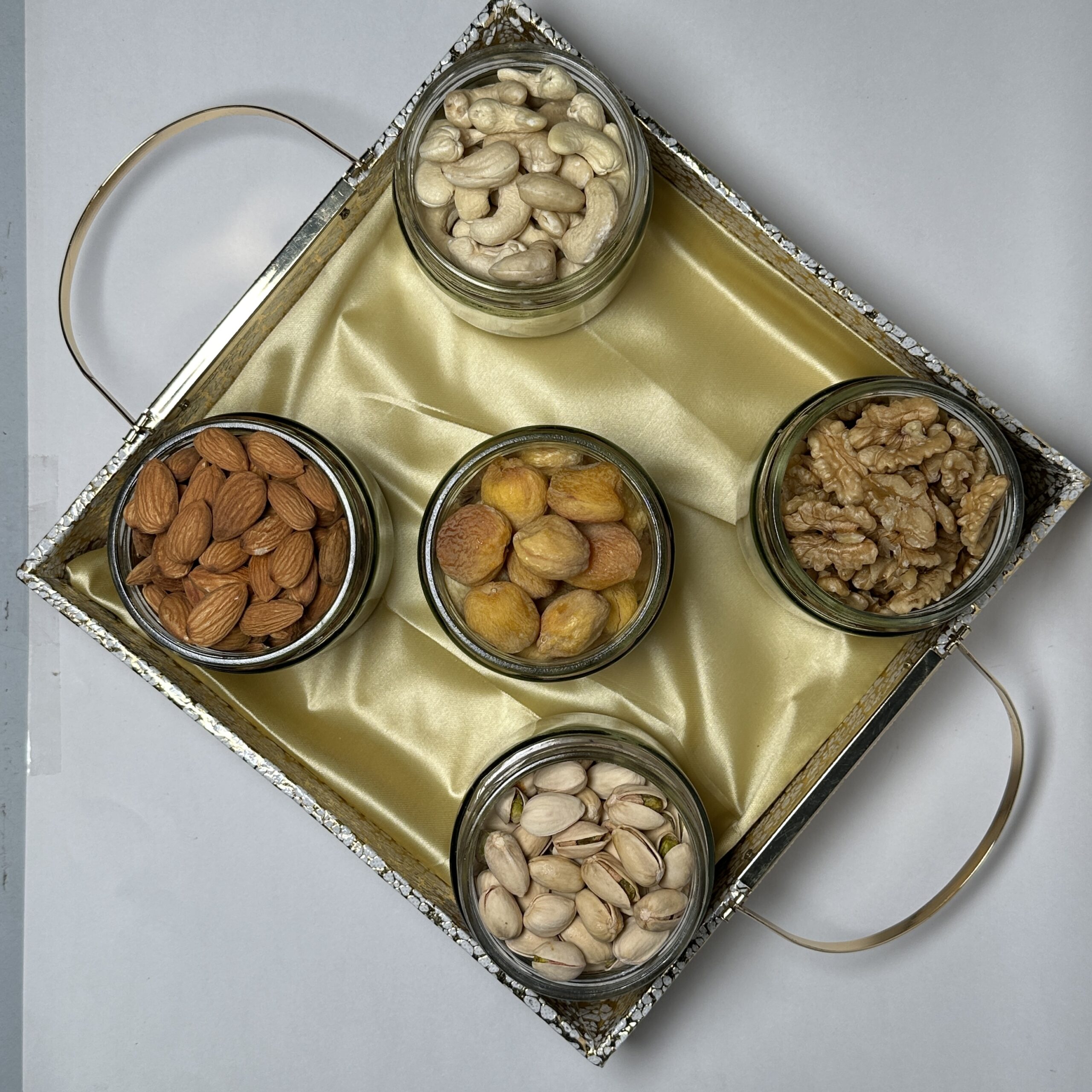 Perfect for gifting or personal indulgence, this exquisite tray features 5 assorted dry fruit jars. Enjoy Plain California Almonds, Roasted & Salted or Plain Cashewnuts, Pistachios, Chile Walnut Kernels, and Raisins (Kishmish). The tray is professionally shrink-wrapped to ensure freshness. Elevate your snacking experience with this elegant and thoughtful selection.