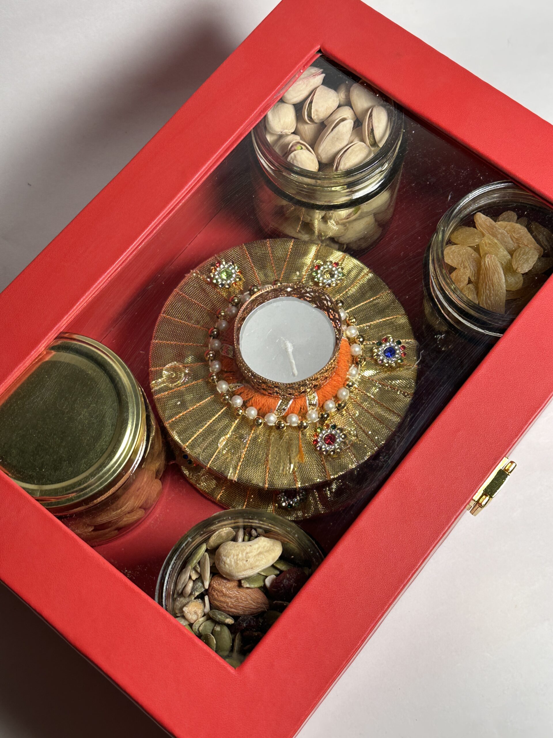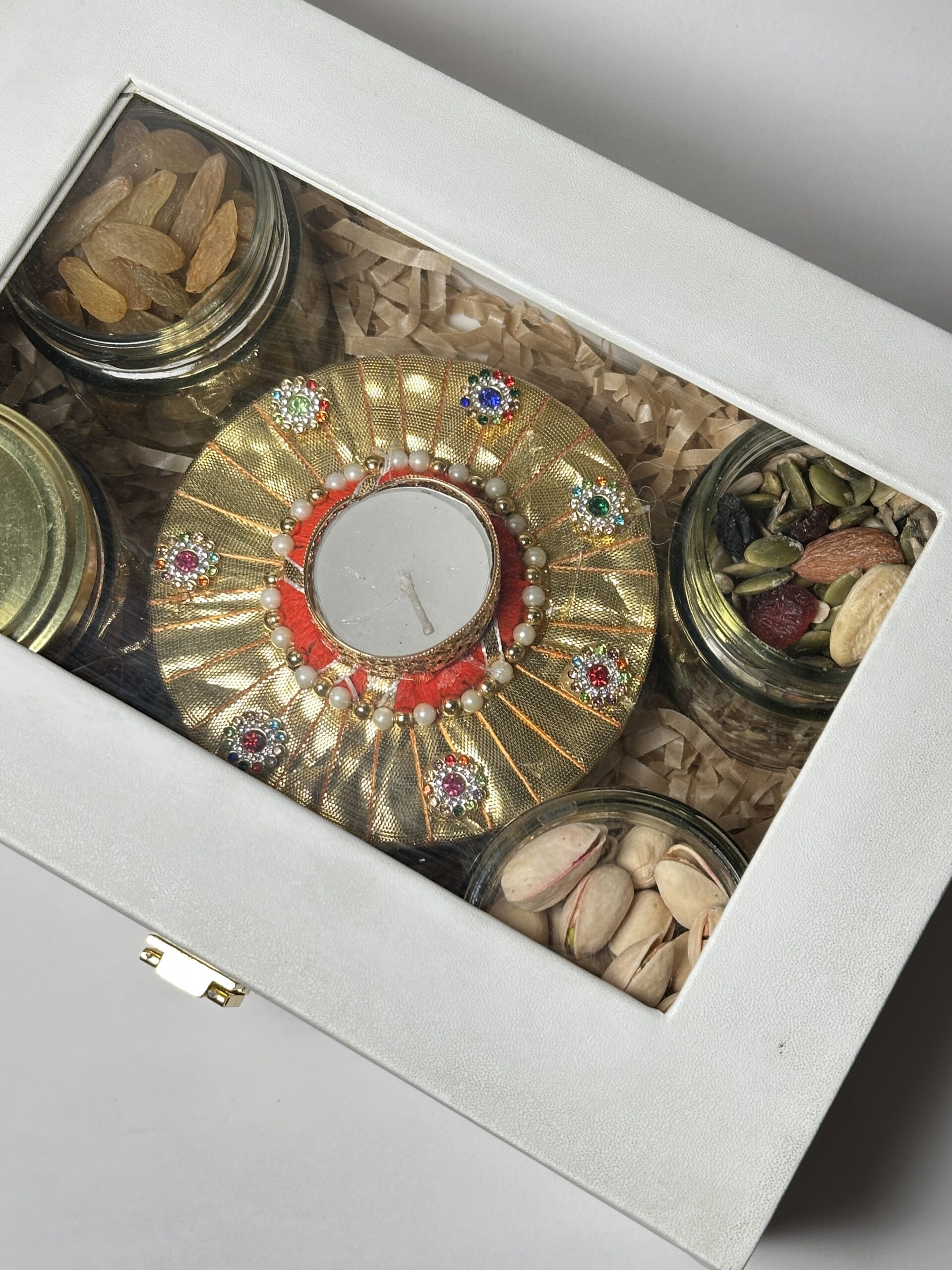 The Leather Box consists of Almonds 115 gm, Pista 85 gm, Raisins 115 gm, Mixed Seeds 120 gm, 2 Diyas