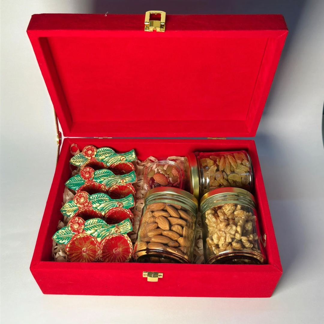 The Velvet Box consists of Almonds 115 gm, Walnuts 55 gm, Raisins 115 gm, Sample Mixed Seeds 25 gm, 4 twin diyas